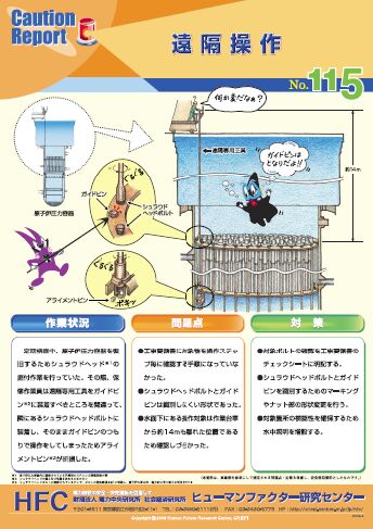 作業状況定期検査中、原子炉圧力容器を復旧するためシュラウドヘッド※1の据付作業を行っていた。その後、保守作業員は遠隔専用工具をガイドピン※2に装着すべきところを間違って、隣にあるシュラウドヘッドボルトに装着し、そのままガイトピンのつもりで操作をしてしまったためアライメントピン※3が損傷した。※1 原子炉圧力容器ないに設置されている円筒状のステンレス製構造物の蓋 ※2 シュラウドヘッドの据付位置を決めるためのピン ※3 シュラウドヘッドボルトに溶接されているピンで、ボルトの回転範囲を90°に制限し、原子炉の周方向・径方向に切替える役目を有する 問題点