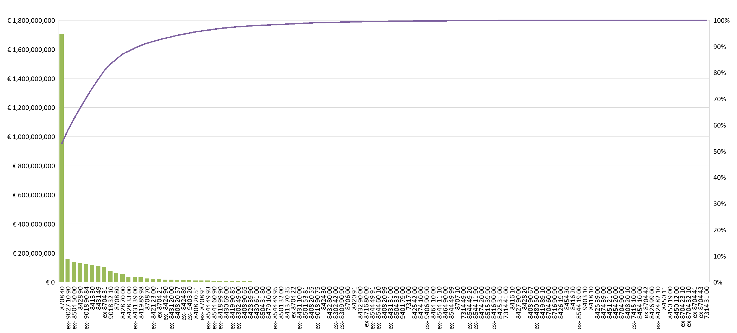 続いて、具体的な影響が及びうる業種を特定するため、追加提案された複合金属製品のうち、日本からの輸入額が大きいものを見ていく。図1に示すパレート図は、107品目を日本からの輸入額(2024年、左軸)が大きい順に左から右へと並べ、曲線(右軸)で累積の比率を表したものである v) 。一目瞭然なのは、「8708 40」の品目コードで表される「変速機とその部品(自動車用のもの)」の割合が圧倒的に大きく、これだけで追加提案品目の全輸入の半分以上を占めることである。